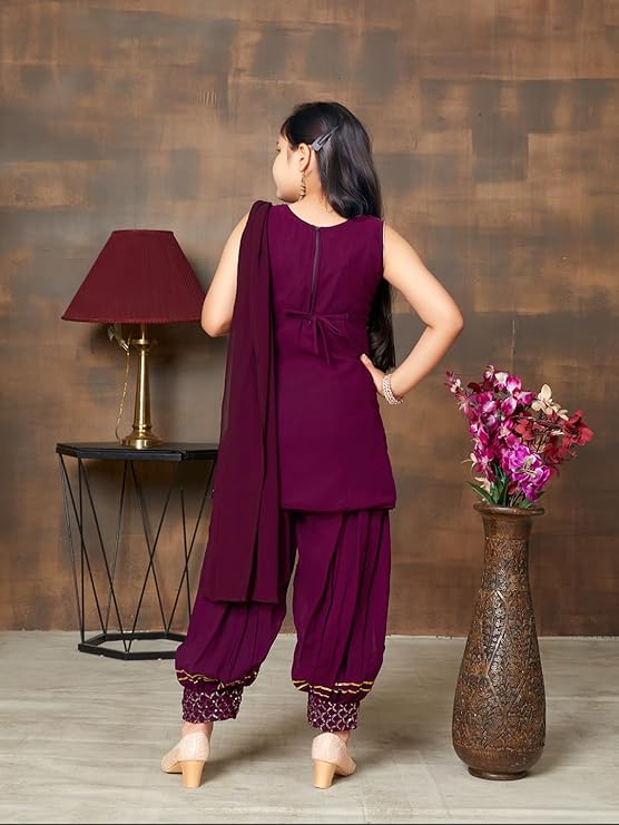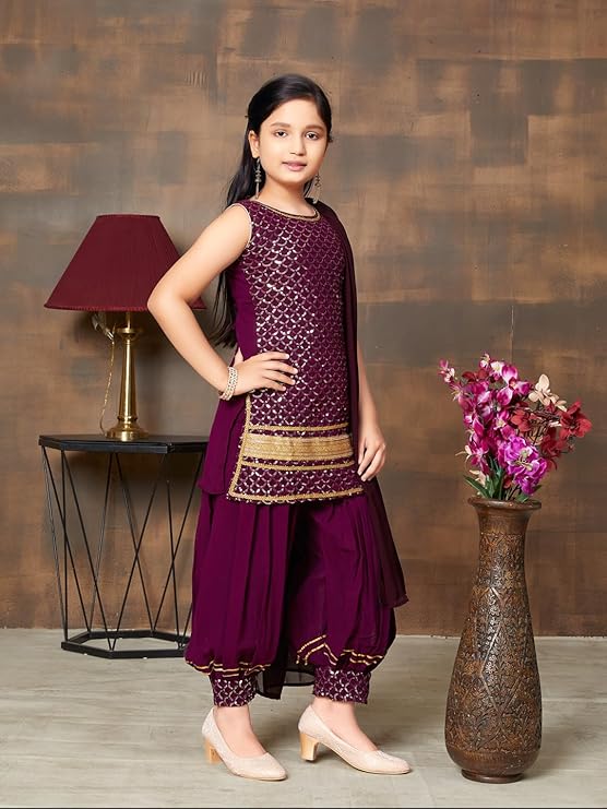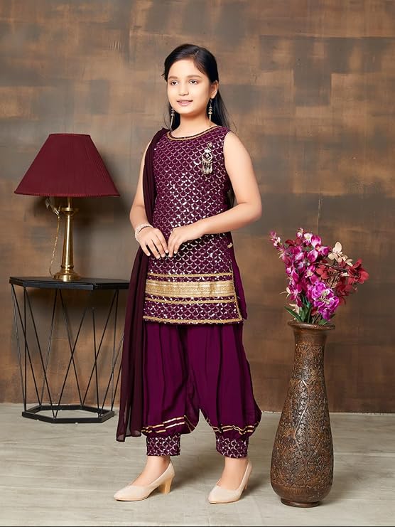 Aarika Girl's Georgette Ethnic Wear Sequin Embroidery Lace Work Kurti Patiala Suit Set