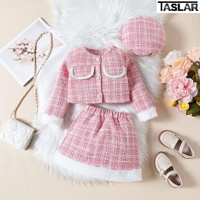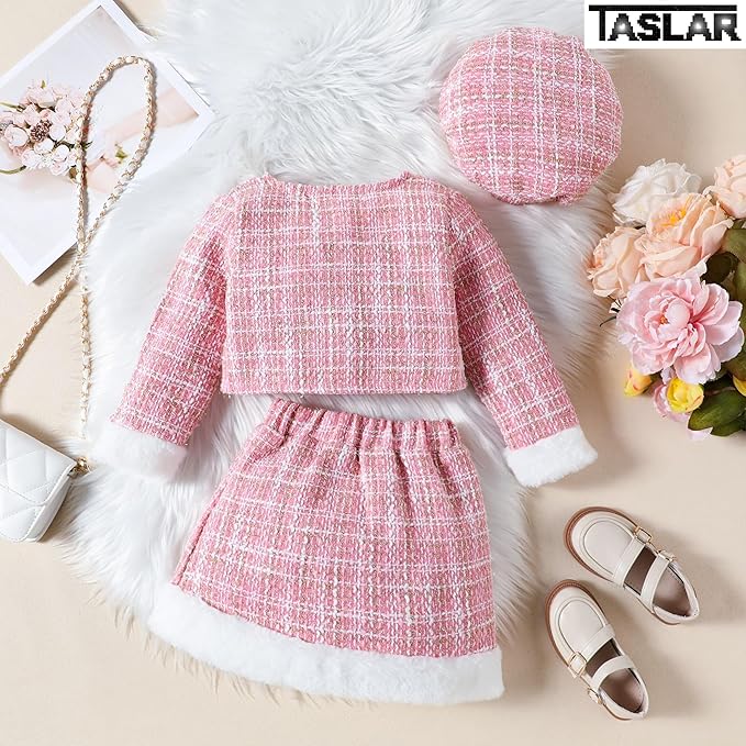 TASLAR Kids Toddler Jacket Baby Girls Suit Furry Patchwork Coat + Skirt + Beret 3Pcs Long Sleeve Shirt Tops Skirts Hat Sets Kids Casual Fashionable Party Dress