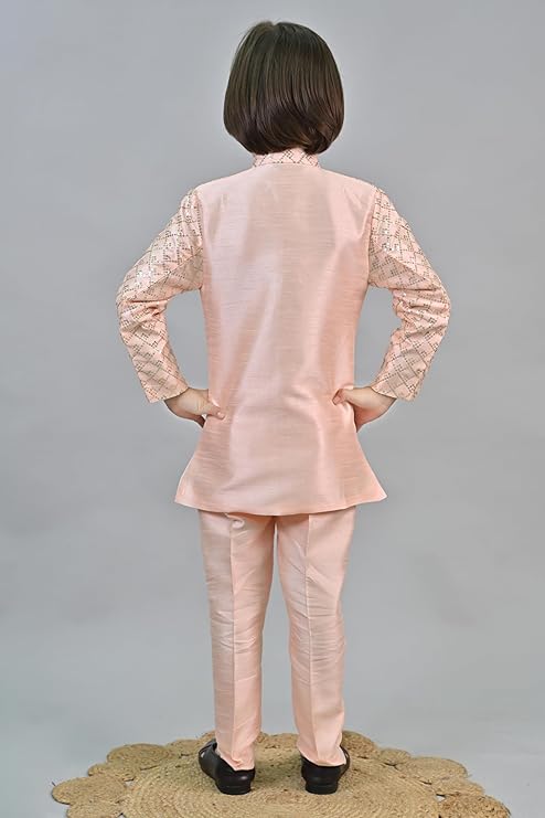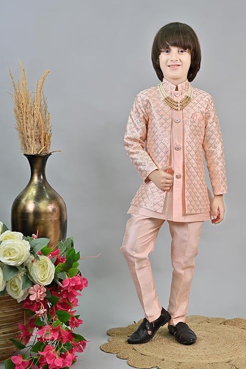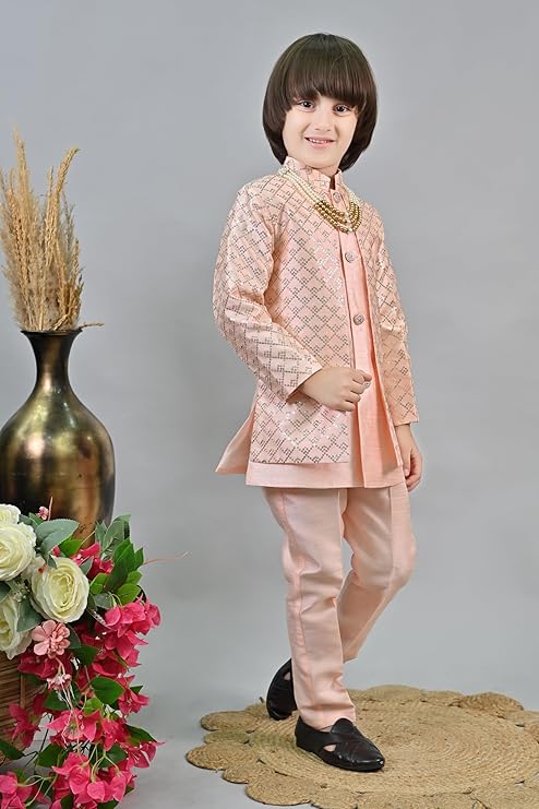 AHHAAAA Kids Ethnic Jacquard Silk Sequin Printed Indo-Western Sherwani Set with Maala for Boys |558|