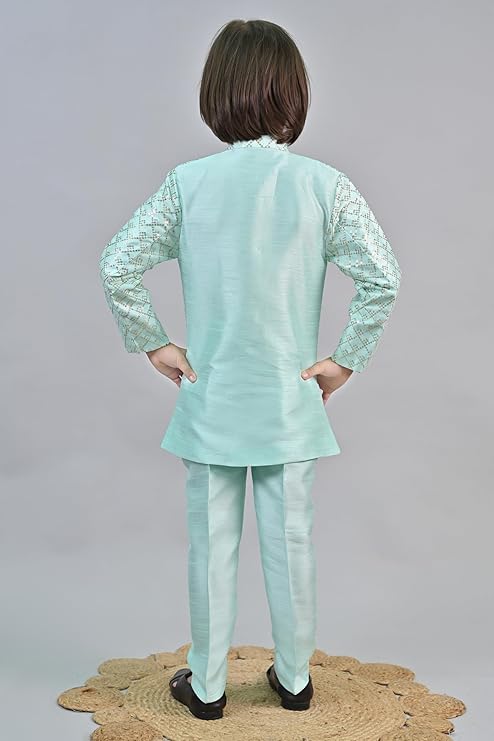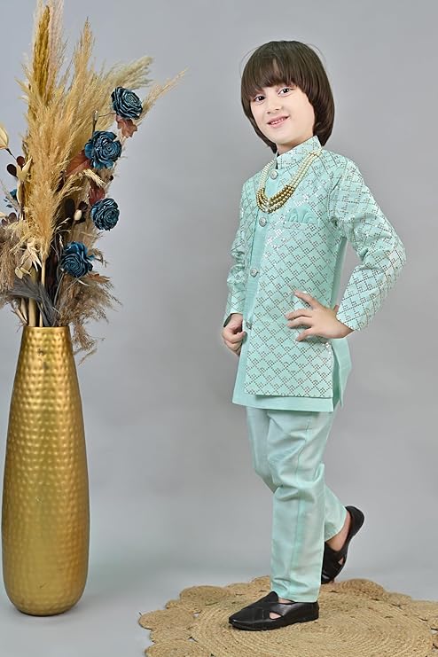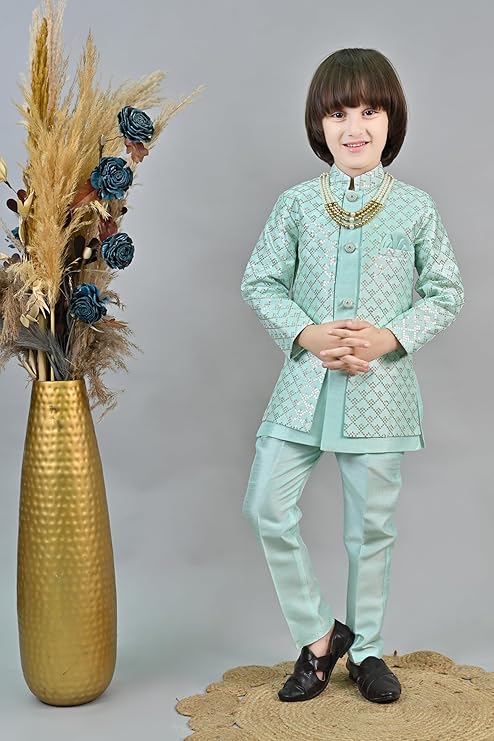 AHHAAAA Kids Ethnic Jacquard Silk Sequin Printed Indo-Western Sherwani Set with Maala for Boys |558|