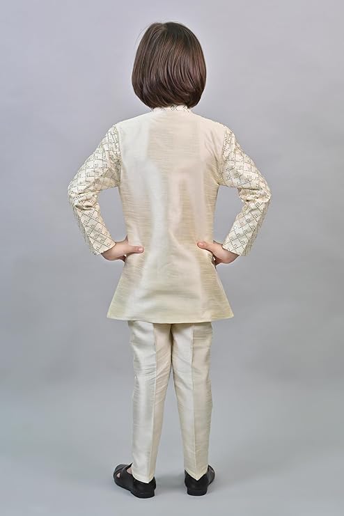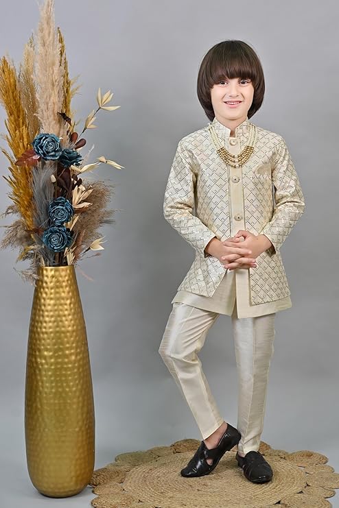 AHHAAAA Kids Ethnic Jacquard Silk Sequin Printed Indo-Western Sherwani Set with Maala for Boys |558|